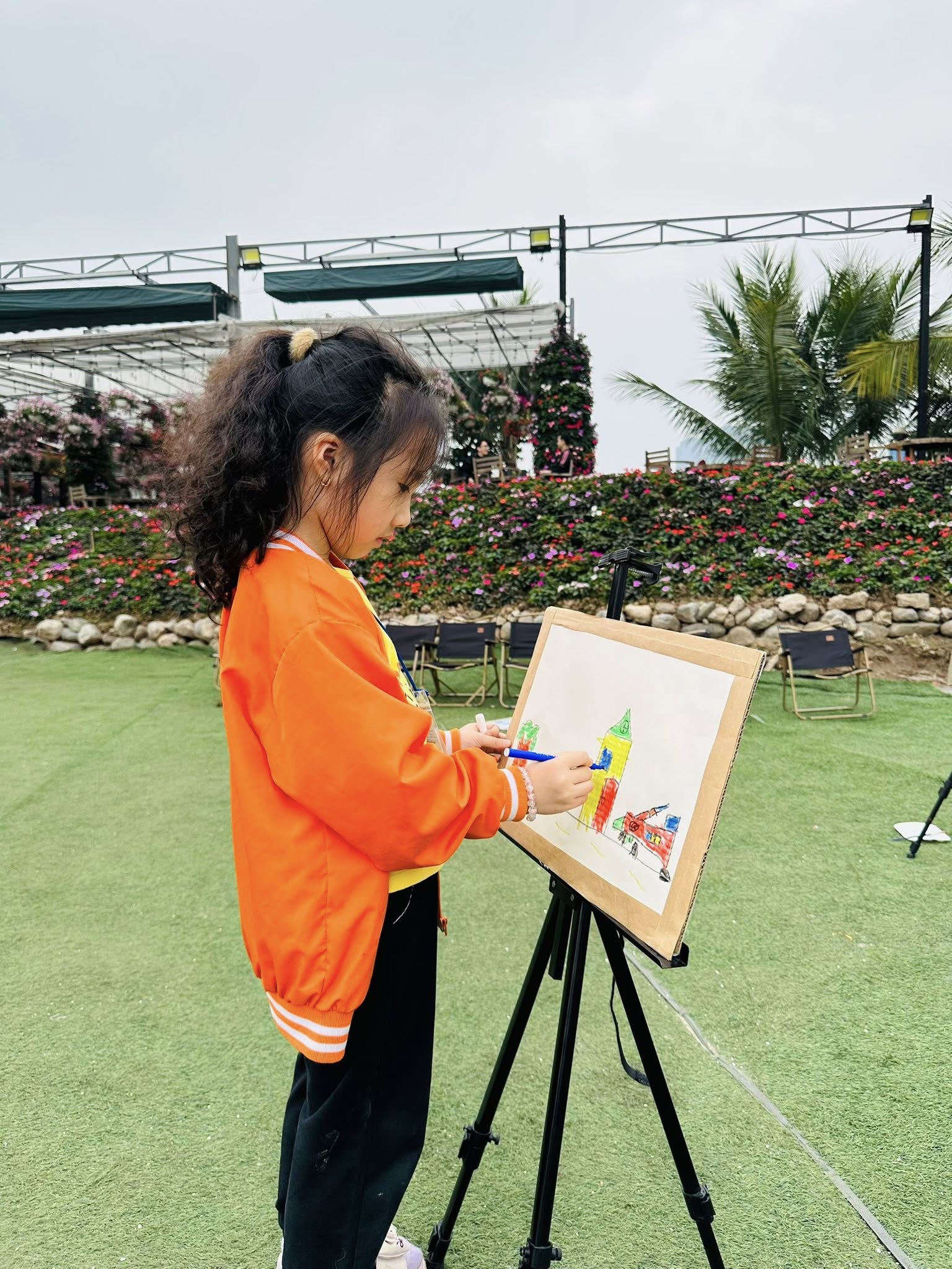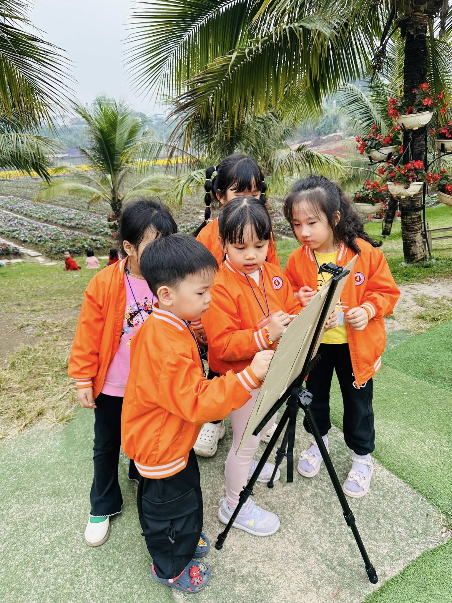 Không chỉ được ngắm hoa, các con còn hào hứng khám phá bể cá với những chú cá bơi lội tung tăng, rồi cùng nhau chơi cát, vẽ tranh, thỏa sức sáng tạo với những bức tranh ngộ nghĩnh mang đậm “chất tuổi thơ”