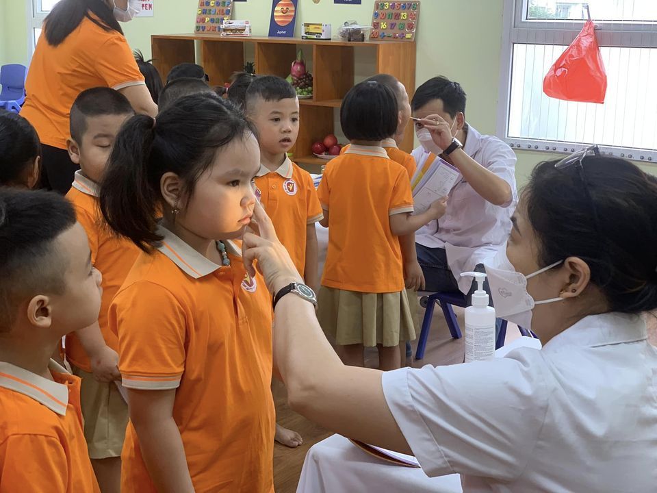 Trong buổi làm việc, các bác sĩ đã thăm khám mắt, tai - mũi - họng, răng - hàm - mặt, da, nghe tim, phổi cho bé.