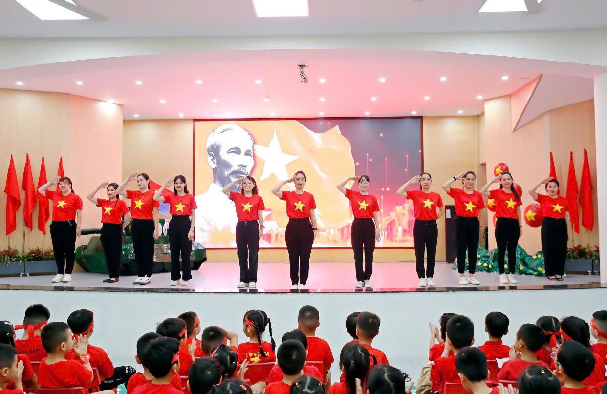 Các bạn nhỏ khối mẫu giáo lớn tham gia biểu diễn dân vũ hai ca khúc: “Như có Bác Hồ trong ngày vui đại thắng” và “Đất nước trọn niềm vui”, mang đến bầu không khí tràn ngập niềm vui, tự hào và sự hứng khởi.