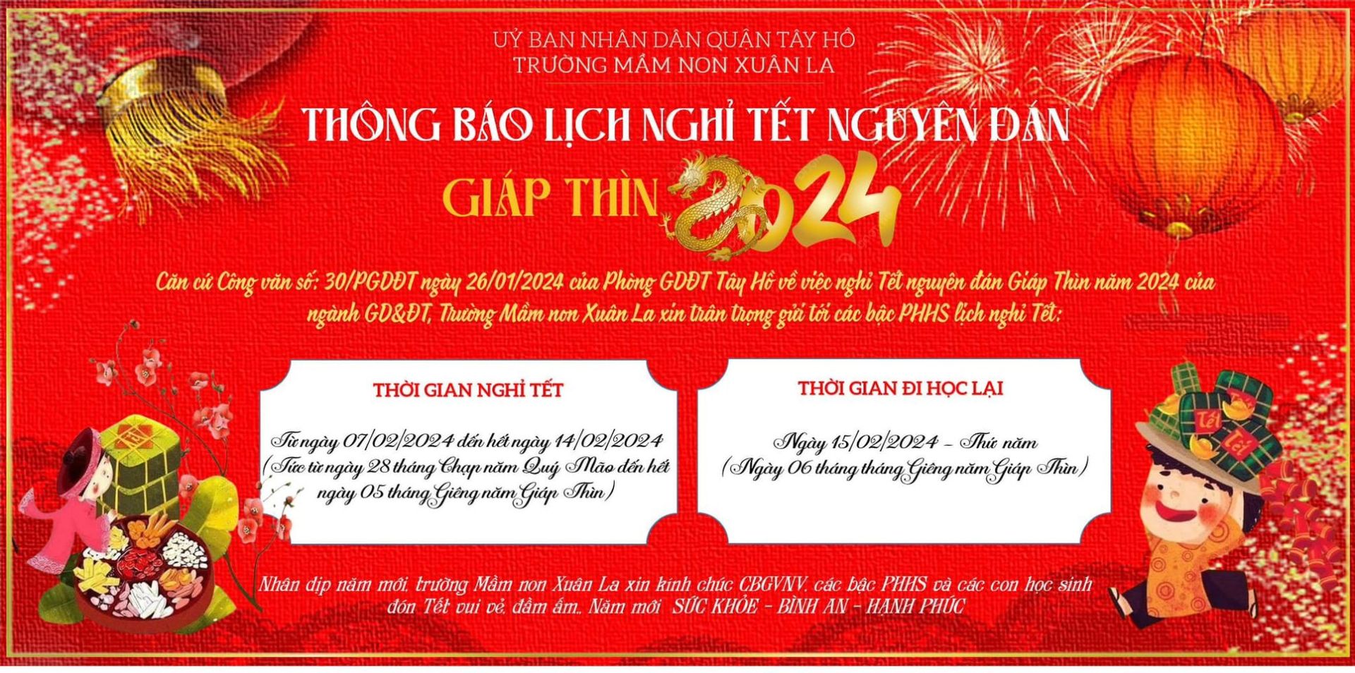 Trường MN Xuân La kính gửi quý phụ huynh lịch nghỉ tết nguyên đán Giáp Thìn 2024. Trân trọng!