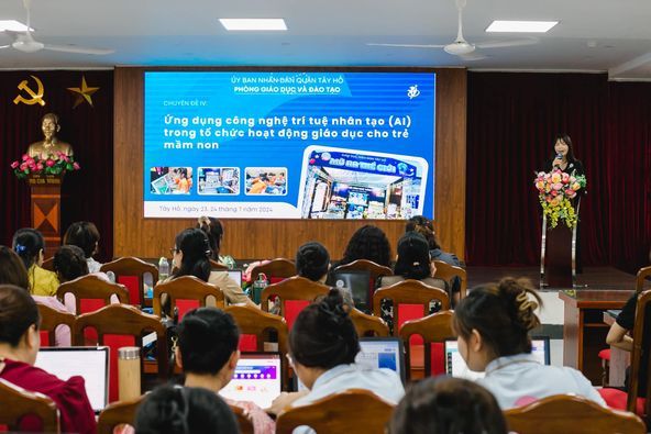 Phát biểu khai mạc lớp bồi dưỡng, bà Nguyễn Bích Huyền – Phó trưởng Phòng GDĐT Tây Hồ nhấn mạnh: “Việc thực hiện Nghị quyết 29-NQ/TW về đổi mới căn bản, toàn diện giáo dục mầm non là nhiệm vụ vô cùng quan trọng đối với các cơ sở giáo dục trong đó có các trường mầm non Tây Hồ, bắt đầu từ việc đổi mới phương pháp giáo dục hướng tiếp cận với các chương trình giáo dục tiên tiến, ứng dụng linh hoạt trong phát triển chương trình giáo dục trong các nhà trường. Đồng thời, việc ứng dụng trí tuệ nhân tạo trong tổ chức các hoạt động giảng dạy sẽ đem tới cho trẻ mầm non sự hứng thú, nhu cầu được tham gia hoạt động chơi mà học, đưa trẻ gần hơn với phương tiện giáo dục hiện đại mang tính xã hội…”