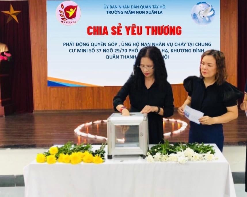 Sau những phút ổn định đầu giờ, cô và trò nhà trường cùng tổ chức lễ tưởng niệm các nạn nhân đã tử vong trong vụ cháy tại phố Khương Hạ (Thanh Xuân, Hà Nội). Nhà giáo Huỳnh Minh Hương - Bí thư chi bộ, Hiệu trưởng thay mặt Ban giám hiệu nhà trường đã phát động tới 100% CB-GV-NV, phụ huynh học sinh trong toàn trường quyên góp, ủng hộ nhằm chung tay chia sẻ khó khăn, hoạn nạn, góp phần xoa dịu nỗi đau của các nạn nhân.